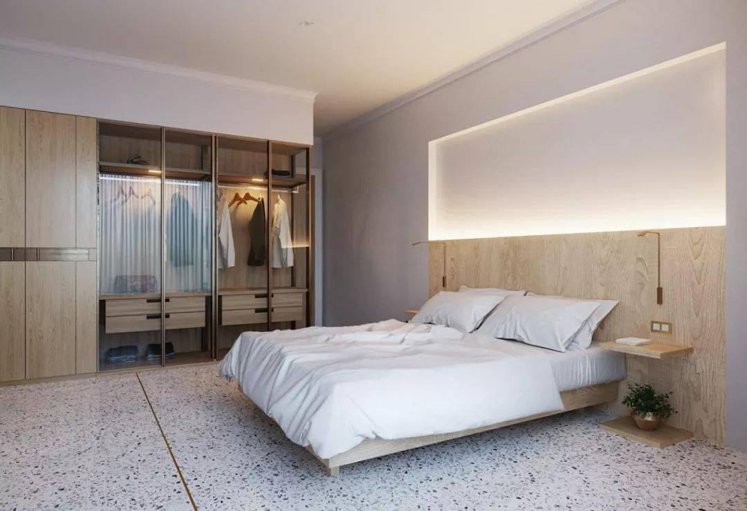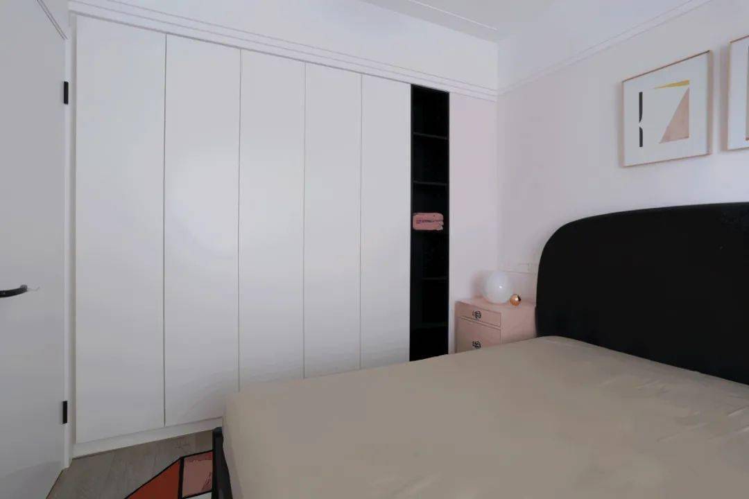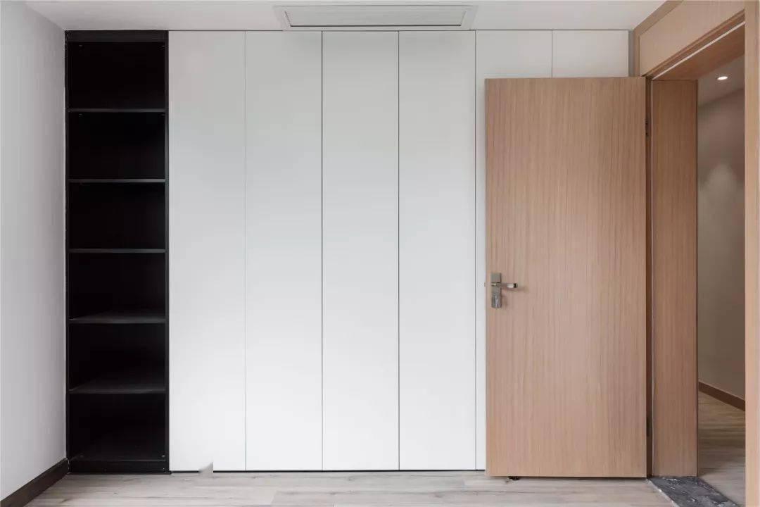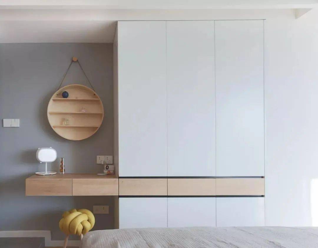 相对于传统衣柜来说,这种与墙面融为一体的衣柜形式,整体感更强,更有利于清洁,比较适合衣物较多,需要较大存放空间的家庭。