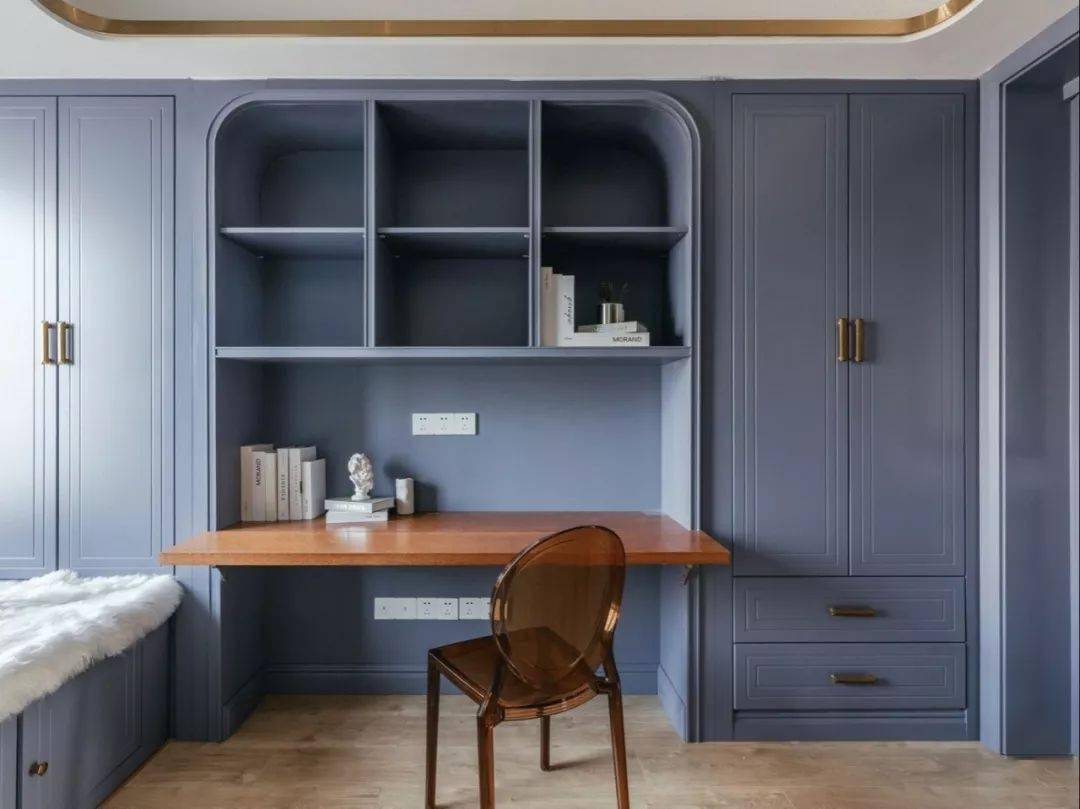 在小小的卧室空间里,组合衣柜很大的优势就在于,它不仅仅发挥了纯粹的衣物收纳功能,还可以与书桌、书架、化妆台、办公区等组合起来,有着超乎想象的实用性。